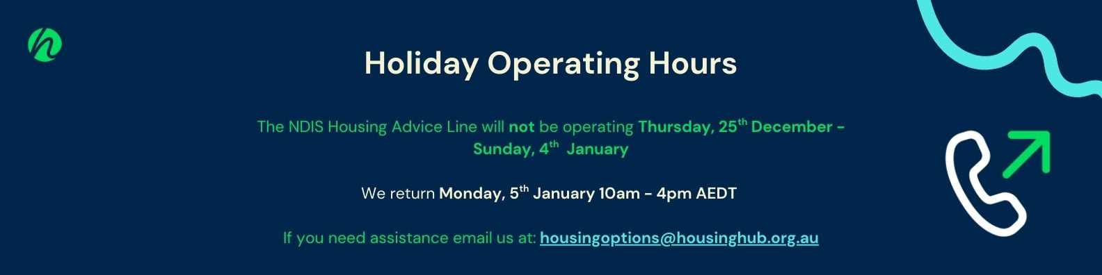 The Housing Hub have a free NDIS Housing Advice Line that operates Monday - Friday 10am - 4pm (AEST).